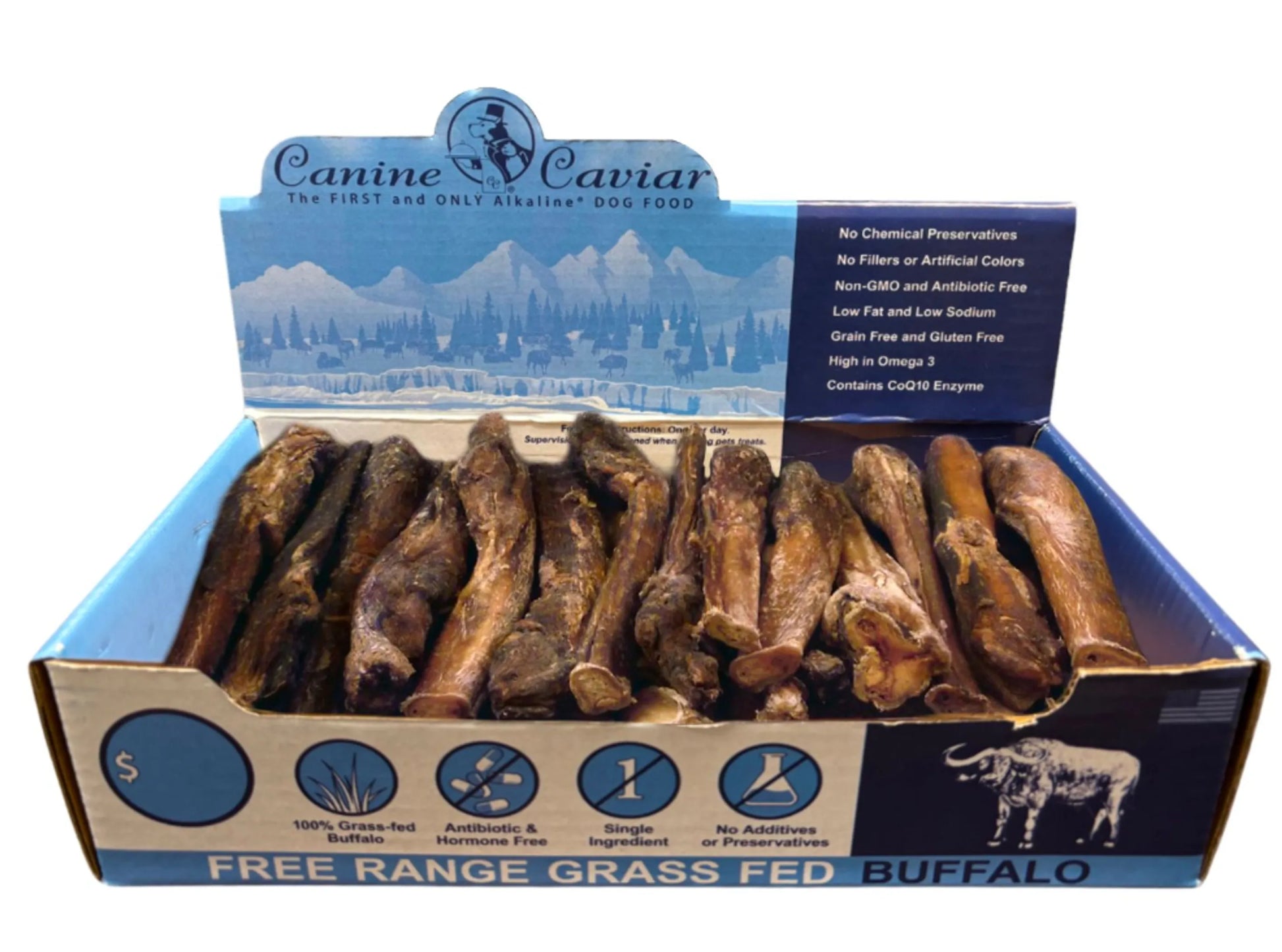 Canine Caviar Buffalo Treats come from premium quality 100% free range grass fed buffalo. They are packed with micro nutrients to support a healthier immune system and better digestion.